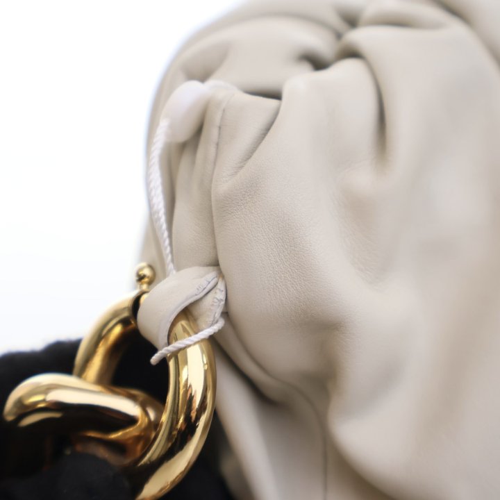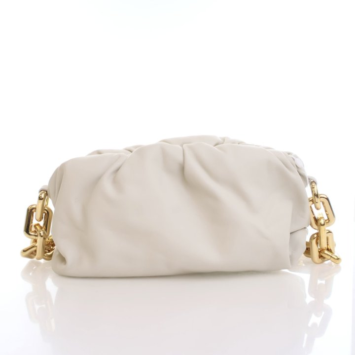 The Bottega Veneta The Chain Pouch is crafted from beige and white calfskin leather with gold-tone hardware. Featuring a sleek and compact silhouette, it is perfect for both everyday wear and evening outings.