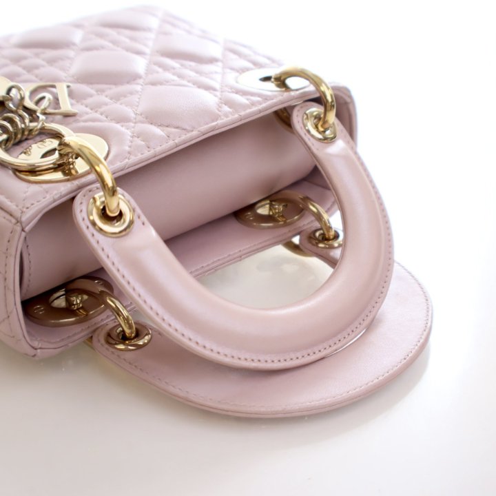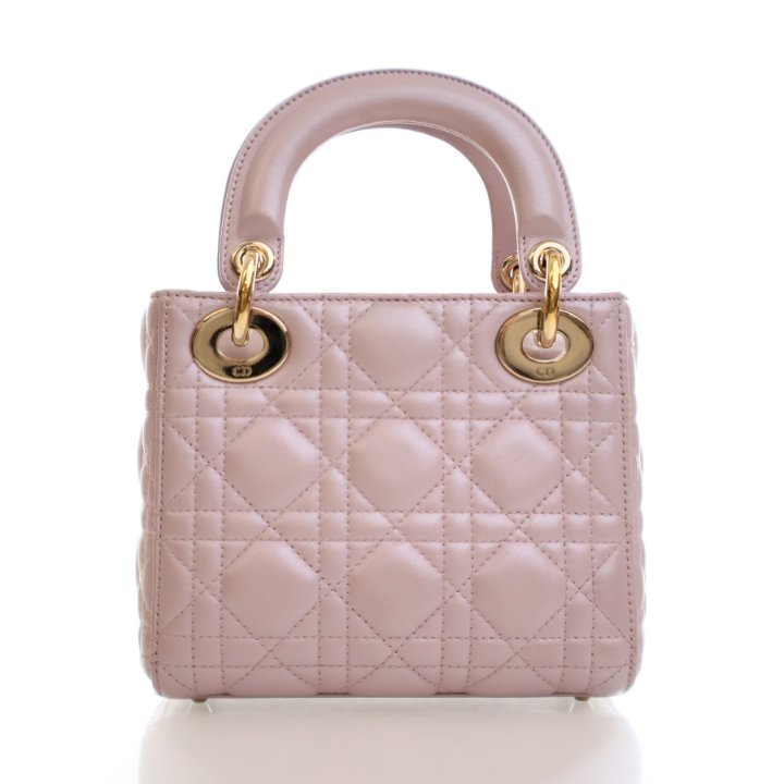 The Mini Lambskin Lady Dior is a luxurious Christian Dior bag in pink lambskin with gold hardware. Its compact silhouette and elegant design make it perfect for both day and evening occasions.
